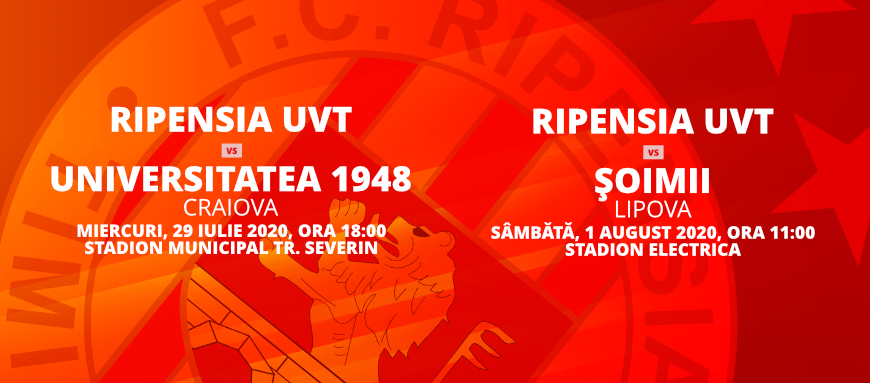 Sâmbătă, 1 august, ora 11:00 / Ripensia UVT Timișoara - Șoimii Lipova (meciul va ava loc la arena ”Electrica).