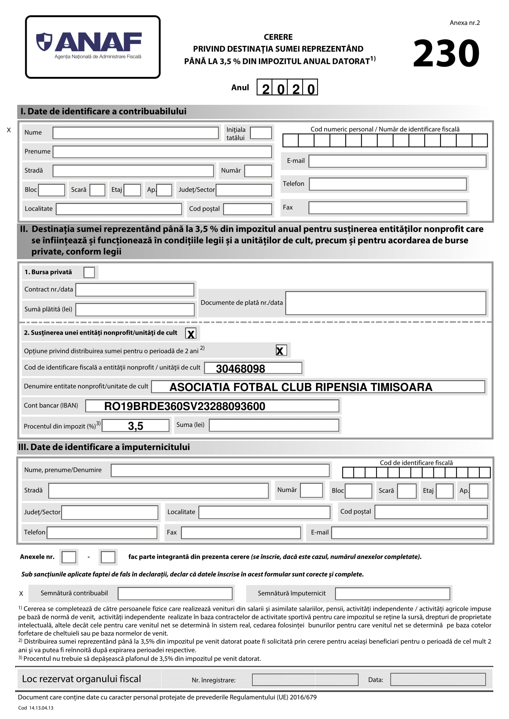 Pe redirectioneaza.ro, poți descărca documentul prin care poți sprijini centrul nostru juvenil. Banii vor fi virați direct în contul Academiei și vor fi utilizați NUMAI pentru cheltuielile legate de activitatea de la copii și juniori. Documentul completat poate fi depus la ANAF, fie la sediul clubului nostru (Piața Libertății nr. 1, parterul Facultății de Muzică / de luni până vineri, orele 9-16, telefon de contact.: 0721 327 448)
