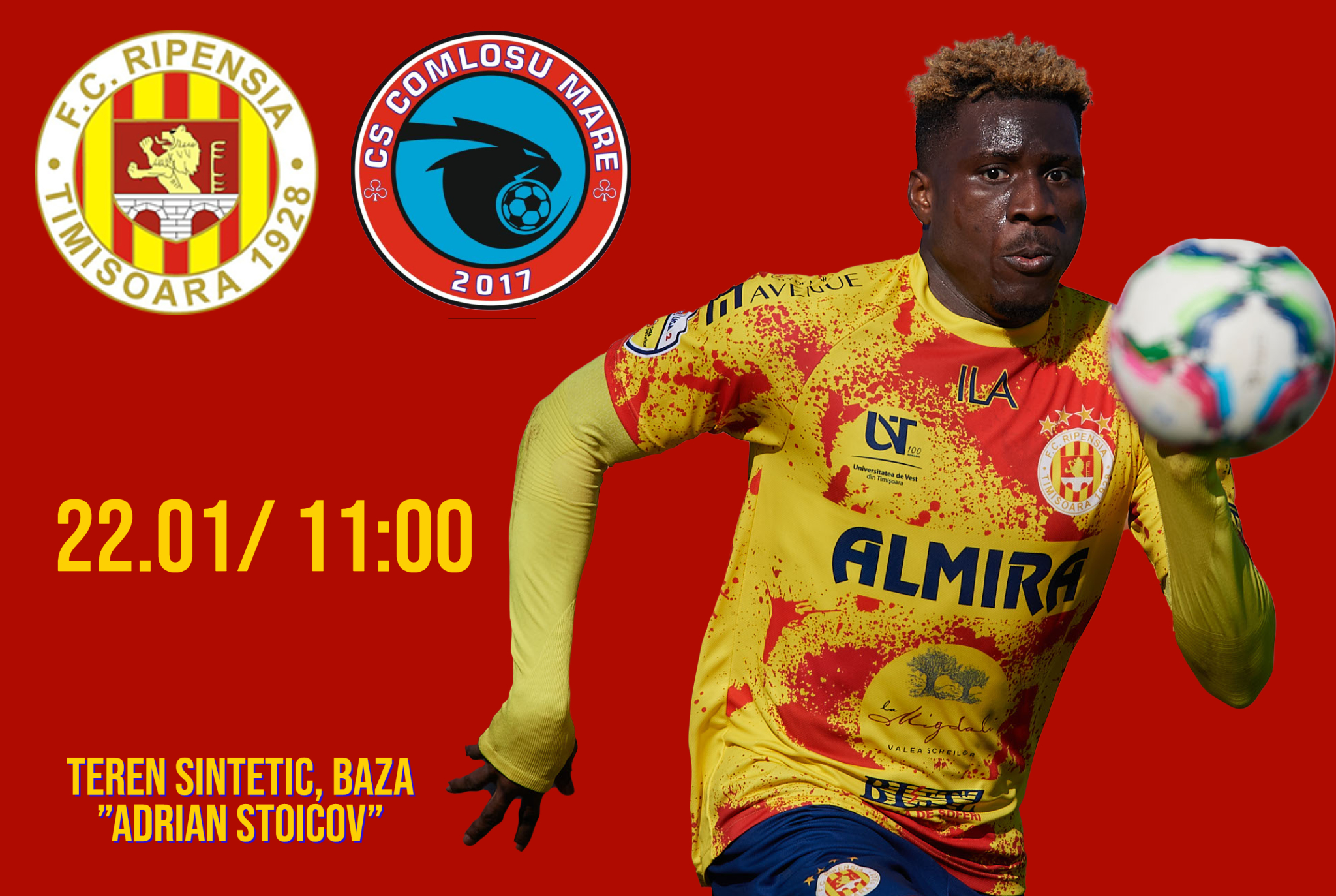 Partida de verificare dintre Ripensia Timișoara și CS Comloșu Mare va avea loc sâmbătă, 22 ianuarie, cu începere de la ora 11. Jocul se va desfășura pe terenul sintetic din complexul de terenuri ”Adrian Stoicov”.