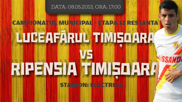 Restanța cu Luceafărul, din prima etapă a returului, se va juca mâine, de la ora 17, pe ˝Electrica˝. Datorită suprafeței de joc mai bune, cele două cluburi au hotărât, de comun acord, ca meciul să aibă loc pe terenul Ripensiei, deși Luceafărul este considerată echipa gazdă. În turul campionatului, în fața unei tribune pline, Ripensia revenea pe gazon după o absență de 64 de ani, învingând la scor, 6-1, trupa antrenată de veteranul Octavian Foale.